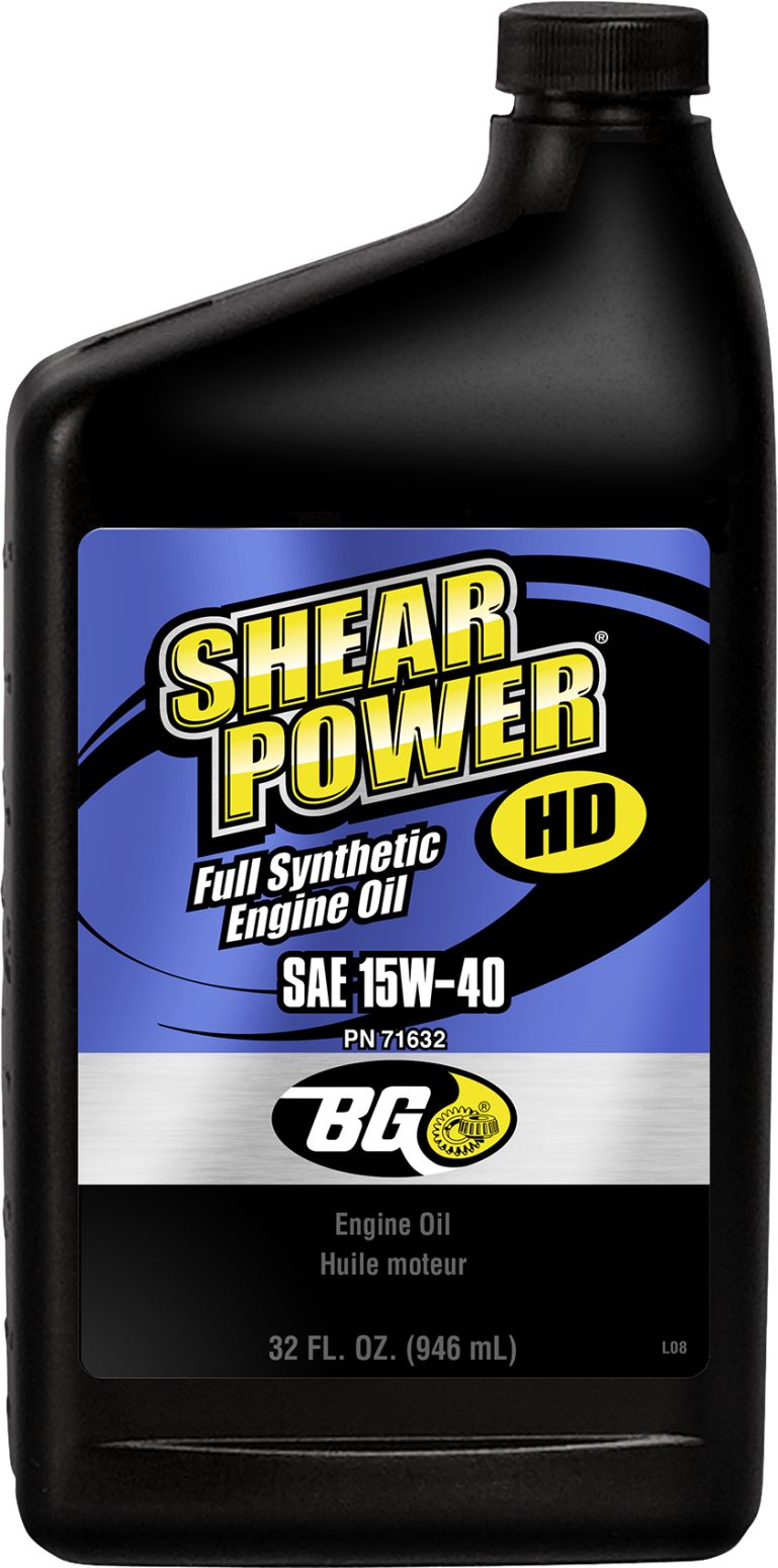 BG Shear Power Full Synthetic Engine Oil is een volsynthetische SAE 15W-40 motorolie, speciaal voor diesels. Het is een zogenaamde low-ash motorolie, met een versterkt detergentenpakket, en zorgt voor uitstekende vloeibaarheid bij lage temperaturen én is goed bestand tegen oxidatie.